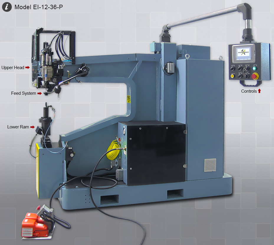 The EI - Portable Rivet Machine is an automatic drill, seal, rivet machine, utilizing an interchangeable mini-hopper rivet feed system. It is a self-contained system with associated power and control elements all mounted on a roll around cart or C-frame structure.